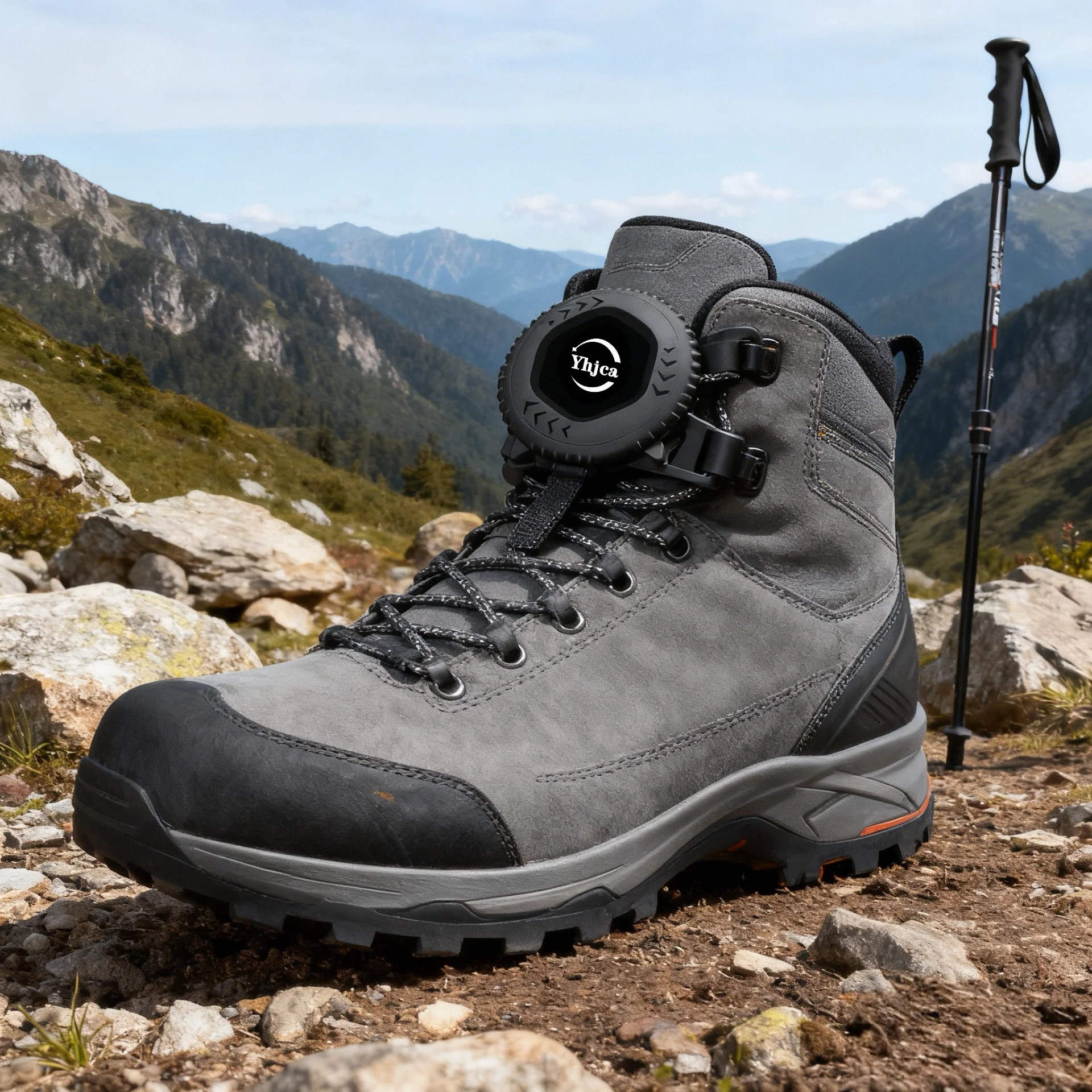 Beim Klettern auf schroffen Bergstraßen und steilen Hängen ermöglicht die rotierende Schnürsenkel schnalle eine segmentierte Dichtheit seins tellung-Festziehen um den Knöchel für eine verbesserte Unterstützung und leichte Lockerung am Vorfuß für eine bessere Flexibilität. Es verriegelt den Fuß fest, um ein Verrutschen zu verhindern, und bietet in Kombination mit der rutsch festen Sohle des Wanders chuhs einen stabilen Schutz für Wanderer, um komplexe Gelände probleme zu bewältigen.